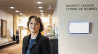 Marianne Schnarwiler vor dem Eingang der Schweizer UNO-Mission, 2002