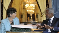 Kofi Annan e Ruth Dreifuss tar la surdada da la medaglia «Genève Reconnaissante» da la citad da Genevra, 28 da matg 2009
