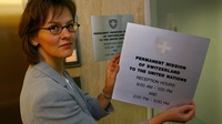 Marianne Schnarwiler davant l'entrada da la Missiun svizra da la ONU, 2002